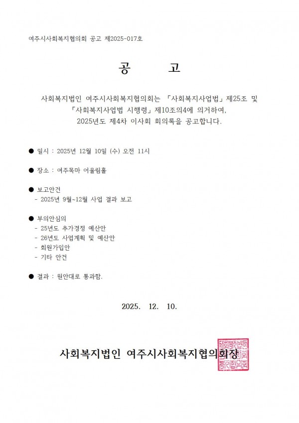 [공고 2025-017호] 제4차 이사회 결과 공고