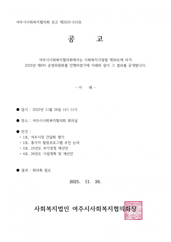 [공고 2025-015호] 제9차 운영위 결과 공고